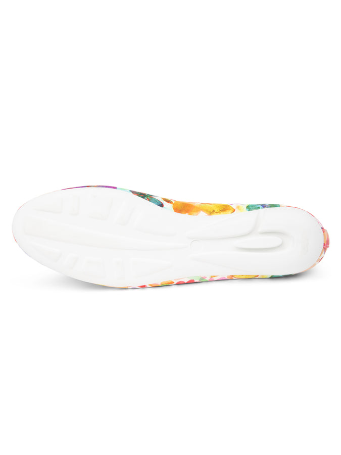 Crafted in supple leather printed with a vibrant multi-color floral motif, this style adds a fresh yet sophisticated accent to your wardrobe. Each pair is thoughtfully finished with our signature adjustable cord bow, allowing for a customized, secure fit. The flexible sole moves naturally with you, offering comfort without sacrificing refinement.