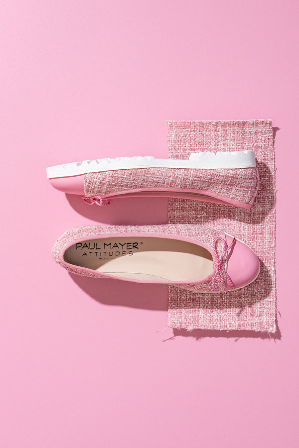 A playful twist on a modern classic. The Bravo Lug Sole Ballet returns in a charming pink tweed that feels fresh, feminine, and unmistakably Paul Mayer Attitudes. Softly textured tweed is paired with a smooth leather cap toe and delicate bow, blending timeless ballet styling with a cheerful pop of color.